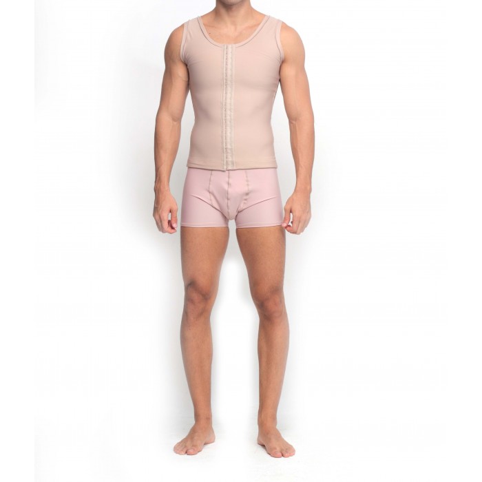 A Camiseta Masculina com abertura frontal por colchetes é indicada em pós-cirurgias (inclusive ginecomastia), tratamento de queimaduras, correção postural, prevenção de flacidez e gordura localizada no abdômen. Composição: 90,4% Poliamida e 9,6% Elastano.