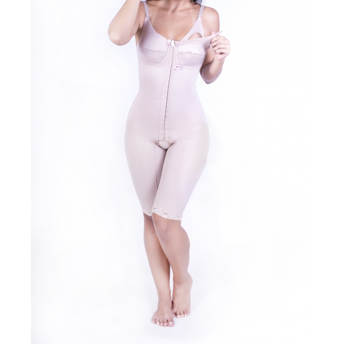 Modelador Amamentação, coleção Maternidade. Confeccionado em cetinete power encorpado, compressivo e com ajuste e conforto na medida ideal. Modelador  sem aro, modela e realça o colo e o busto. Alças reguláveis, que facilita a amamentação pois o busto se destaca por inteiro. Centro do decote com adorno de florzinha. Reforço estratégico em tecido duplo  modelando a silhueta, valorizando a cintura e comprimindo o abdômen. Pernas com acabamento em elástico viés para maior conforto. Abertura frontal com fechamento em colchetes de dupla regulagem. Composição: 90,4% Poliamida e 9,6% Elastano.